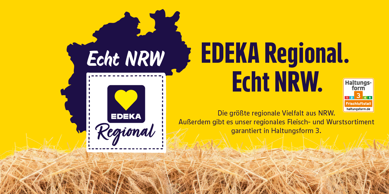 Unsere regionalen Produkte der Marke EDEKA Regional kommen aus NRW, die Marke steht für regionale Qualität, Frische und Vielfalt. Fleisch- und Wurstartikel der Marke EDEKA Regional bieten wir garantiert in Haltungsform 3 an.